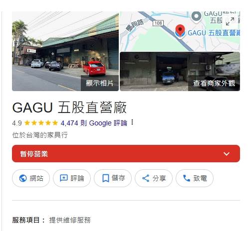 GAGU 五股直營廠在Google上顯示暫停營業。(圖/翻攝自GOOGLE)