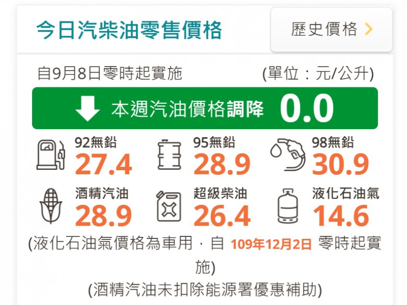 台灣中油公司宣布,自明(8)日凌晨零時起汽、柴油價格皆不予調整,參考零售價格分別為92無鉛汽油每公升27.4元、95無鉛汽油每公升28.9元、98無鉛汽油每公升30.9元、超級柴油每公升26.4元。