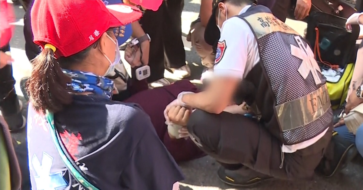 白沙屯媽祖高雄遶境第二天,岡山地區鑽轎底民眾相當踴躍,粉紅超跑本來往前走,突然又繞回來,原來有一名男子癲癇發作,倒臥在地一旁的阿嬤,朝神轎雙手合十相當虔誠,救護人員很快趕到,先幫忙散熱準備要送醫,遭到阿嬤拒絕。